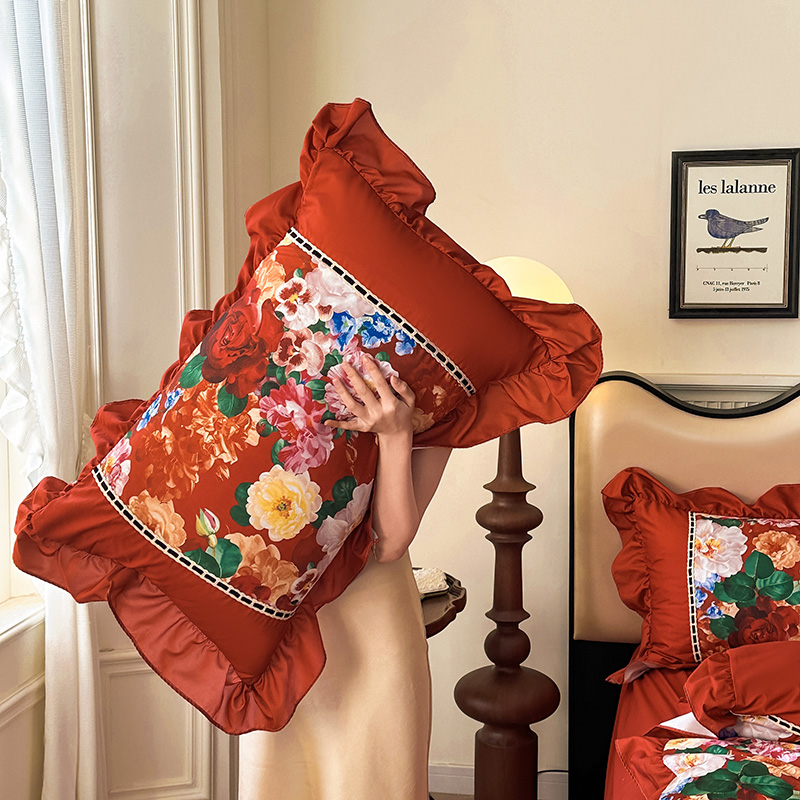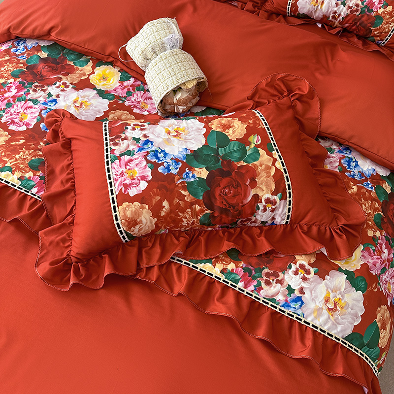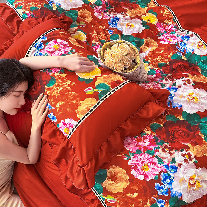 2024夏季新款细丝水洗磨毛法式格调双拼印花贡棉四件套